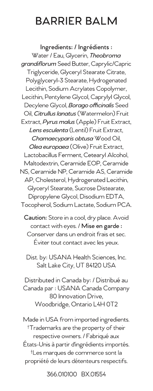 How it Works: Postbiotics—a natural by-product of probiotic fermentation—lock in moisture, replenish the skin’s moisture barrier, and defend against environmental irritants. USANA’s postbiotic skincare works in harmony with your skin to promote a happy, well-balanced complexion. Our Barrier Balm offers cooling and gentle relief from dryness or skin sensitivity, acts like a second skin to seal in hydration and help visibly restore moisture levels.